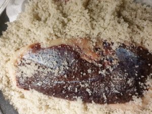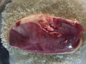 Ensuite y déposer le magret et le recouvrir de sel, n’hésitez pas à utiliser le sel des contours qui n’ont pas de contact avec la viande