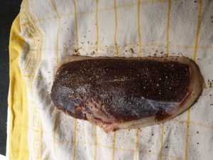 Mettre le magret sur votre torchon propre, poivrer si vous le désirez, vous pouvez aussi ajouter des herbes, du piment d’Espelette.